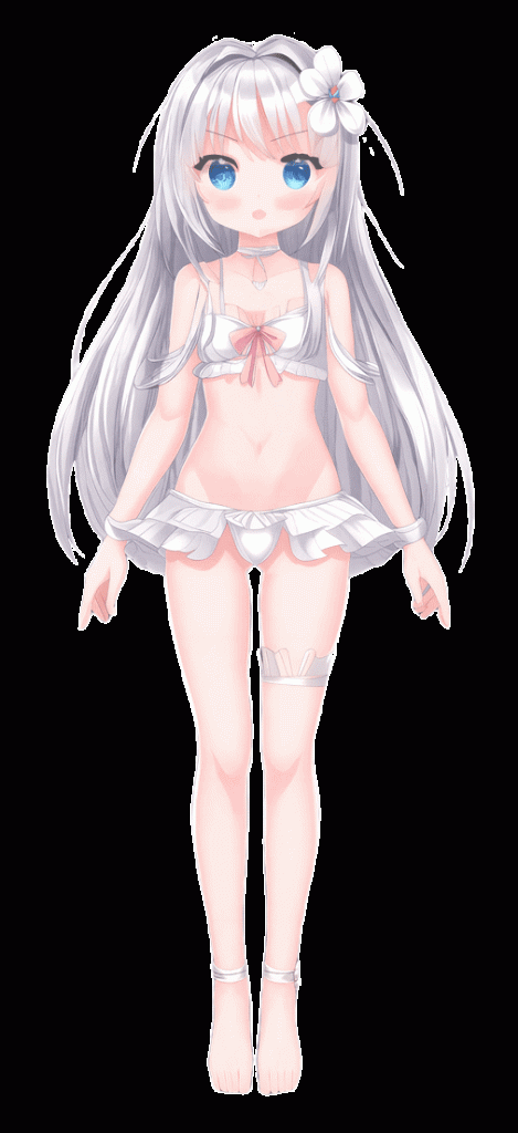 魔法少女形态,身体会稍微长高一点,大概135cm左右(10岁?)高吧。瞳孔会变成微微发光的亮蓝色,白色长发则会被蓝色缎带扎成对称双马尾披在身体两侧。至于衣着方面,其实也是超短衬衫+超短裙,不过颜色会固定为蓝色,比咱的瞳色深一点。衬衫上也会出现白色的星星,衬衫和超短裙之间会有白色纱带相连,会盖住腰部。但是保留肚脐和小腹露出。至于下半身,则是前后不对称的设计(不知道是哪个恶趣味的神明),前面很短,能够看到半透明的胖次(是的,变身后的衣服有胖次了,但是半透明)。后面则是一大块半透明的薄纱衣摆,看不见胖次,可是能够看见臀部。